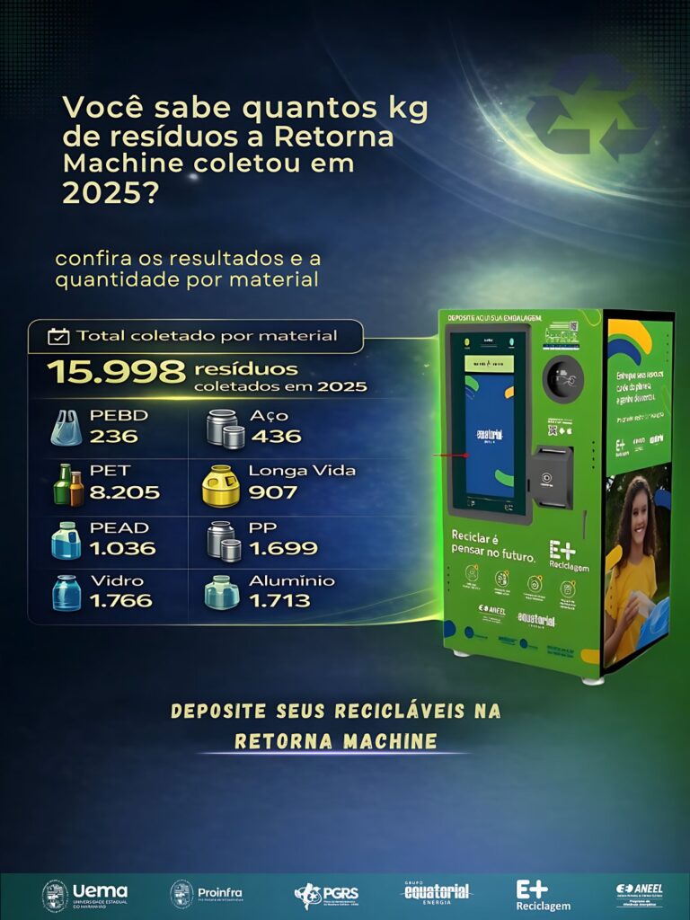 A Universidade Estadual do Maranhão (Uema), por meio da Pró-Reitoria de Infraestrutura (Proinfra) e Coordenação Gestão de Resíduos Sólidos (CGRS) em parceria com a Ambipar e a Equatorial Energia, disponibiliza a Retorna Machine no Campus Paulo VI, instalada no Centro de Educação, Ciências Exatas e Naturais (Cecen).