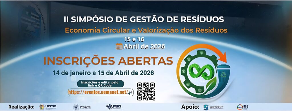 A Universidade Estadual do Maranhão (UEMA), por meio da Pró-Reitoria de Infraestrutura (PROINFRA), Coordenação de Gestão de Resíduos Sólidos (CGRS/PROINFRA) e à Comissão do Plano de Gerenciamento de Resíduos Sólidos (PGRS), apresenta o II Simpósio Gestão de Resíduos: economia circular e valorização de resíduos.